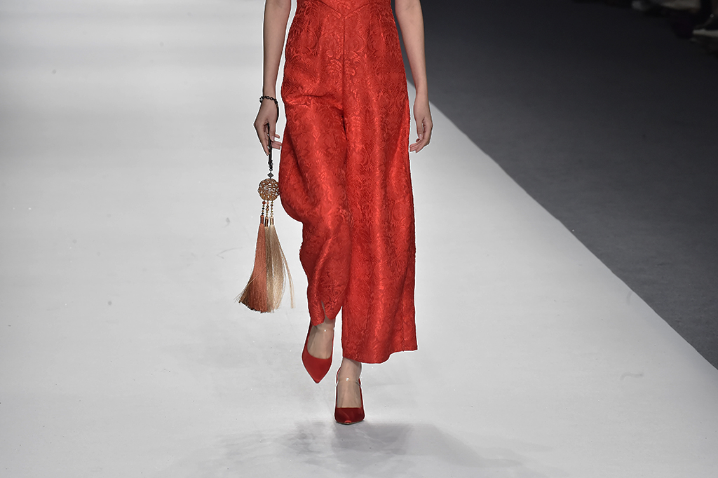 模特正在展示品牌Sunshine見花開的服裝 紅色的服裝盡顯東方美感