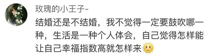 一定要遇到理想的結(jié)婚對(duì)象才會(huì)選擇結(jié)婚。事業(yè)排第一,婚姻排在最后。我進(jìn)入婚姻的初衷是為了讓生活變得更好,而且婚姻更多還是一種合作關(guān)系,兩個(gè)人在一起能夠提高生活品質(zhì),經(jīng)濟(jì)方面相互幫助,降低生活成本,增強(qiáng)風(fēng)險(xiǎn)抵抗能力。身邊朋友未婚的比較多,但有時(shí)看到已婚的朋友生活幸福,會(huì)有短暫的焦慮感,但更多地受到父母不幸的婚姻生活的影響,我對(duì)婚姻基本沒(méi)有什么正面的期望。