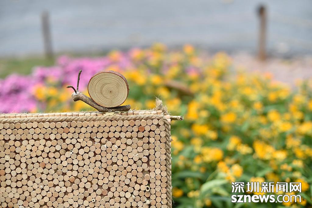 由木頭設(shè)計的“木頭蝸?!秉c綴在花海中