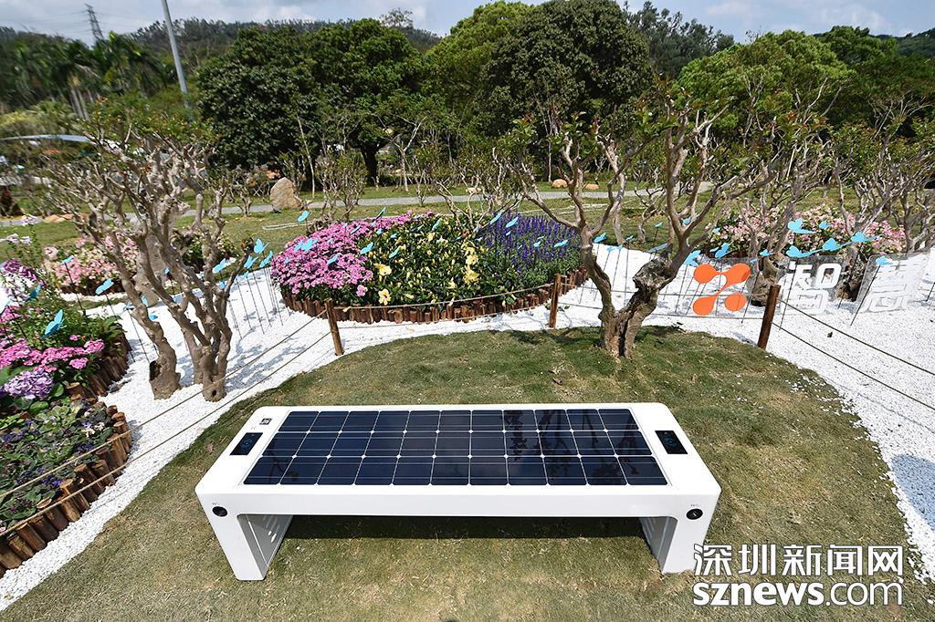 智能座椅被放置在花園中,該座椅利用太陽能發(fā)電,可以進行無線和有線充電