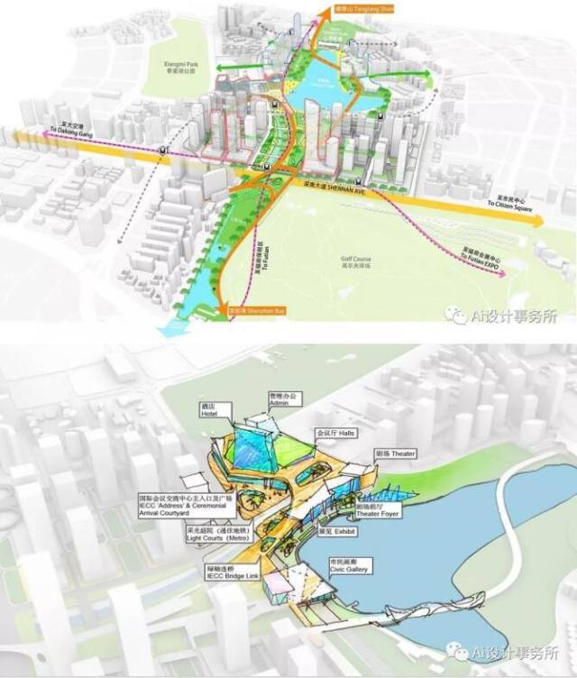 該方案中規(guī)劃了國際交流會議中心、城市演藝中心、城市博物館及雙子金融大廈等,以及地景式過街天橋、中央綠谷公園等。