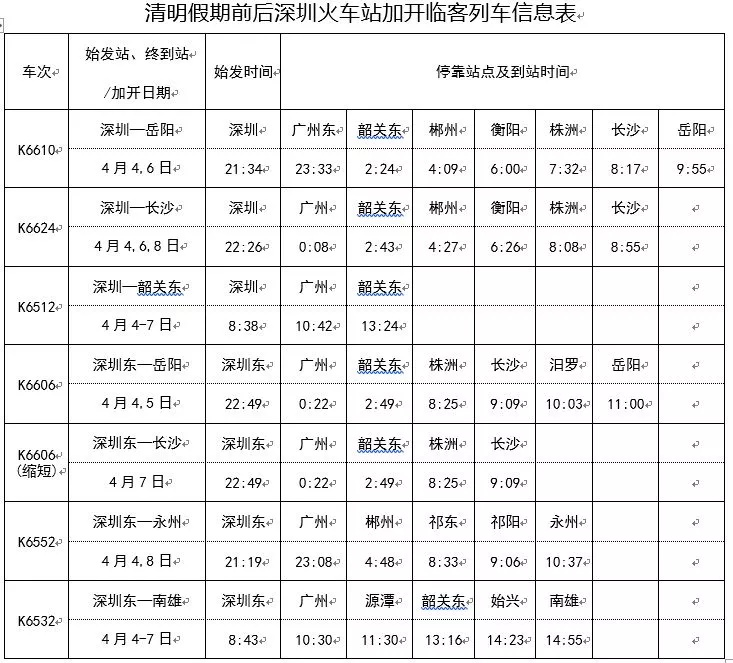 深圳站將加開(kāi)3對(duì)臨客列車(chē),始發(fā)車(chē)次為開(kāi)往岳陽(yáng)的K6610次、開(kāi)往長(zhǎng)沙的K6624次和開(kāi)往韶關(guān)東的K6512次;