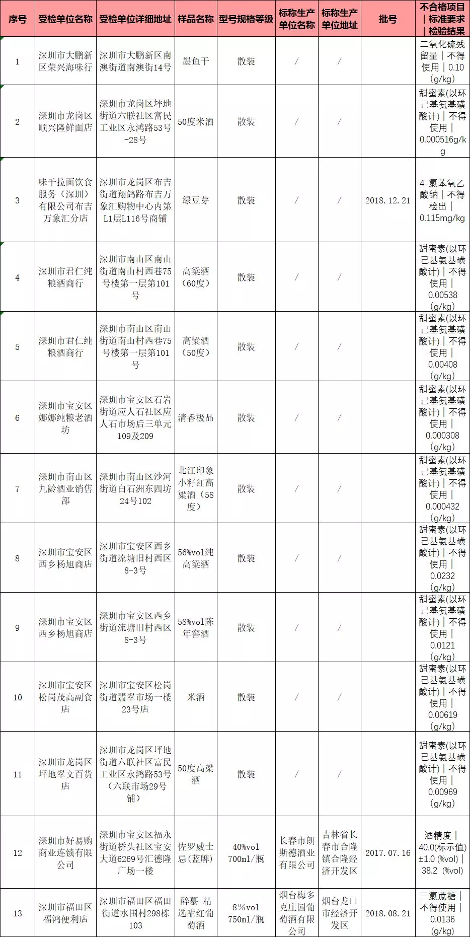 13批次不合格食品,其中酒類占了11批次,大部分原因都在于檢出了甜蜜素。