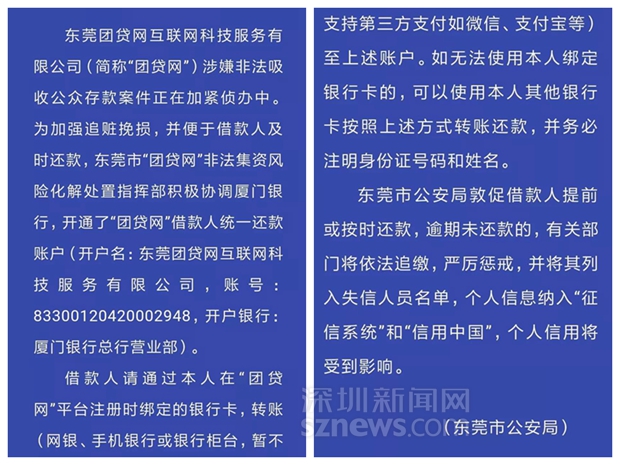東莞警方開設(shè)統(tǒng)一還款賬戶敦促“團(tuán)貸網(wǎng)”借款人還款