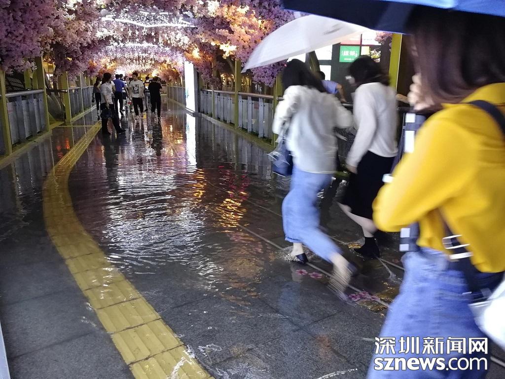 深圳暴雨特效開(kāi)啟,市民紛紛進(jìn)入躲雨模式。(記者 邱曉潔 攝于丹竹頭地鐵站