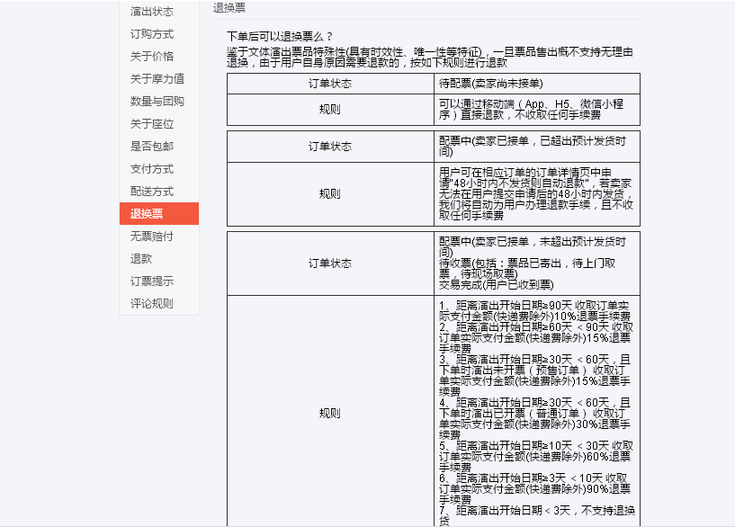 記者隨后從該網(wǎng)站的“訂票提醒”中的退換票規(guī)則中看到,該網(wǎng)站的退換票手續(xù)費實行“階梯費率”,如距離演出開始日期90天或以上,要收取訂單實際支付金額(快遞費除外)10%退票手續(xù)費;距離演出開始日期3天或以上但不超過10天,要收取訂單實際支付金額(快遞費除外)90%退票手續(xù)費,距離演出開始日期3天以內,則不支持退換貨。
