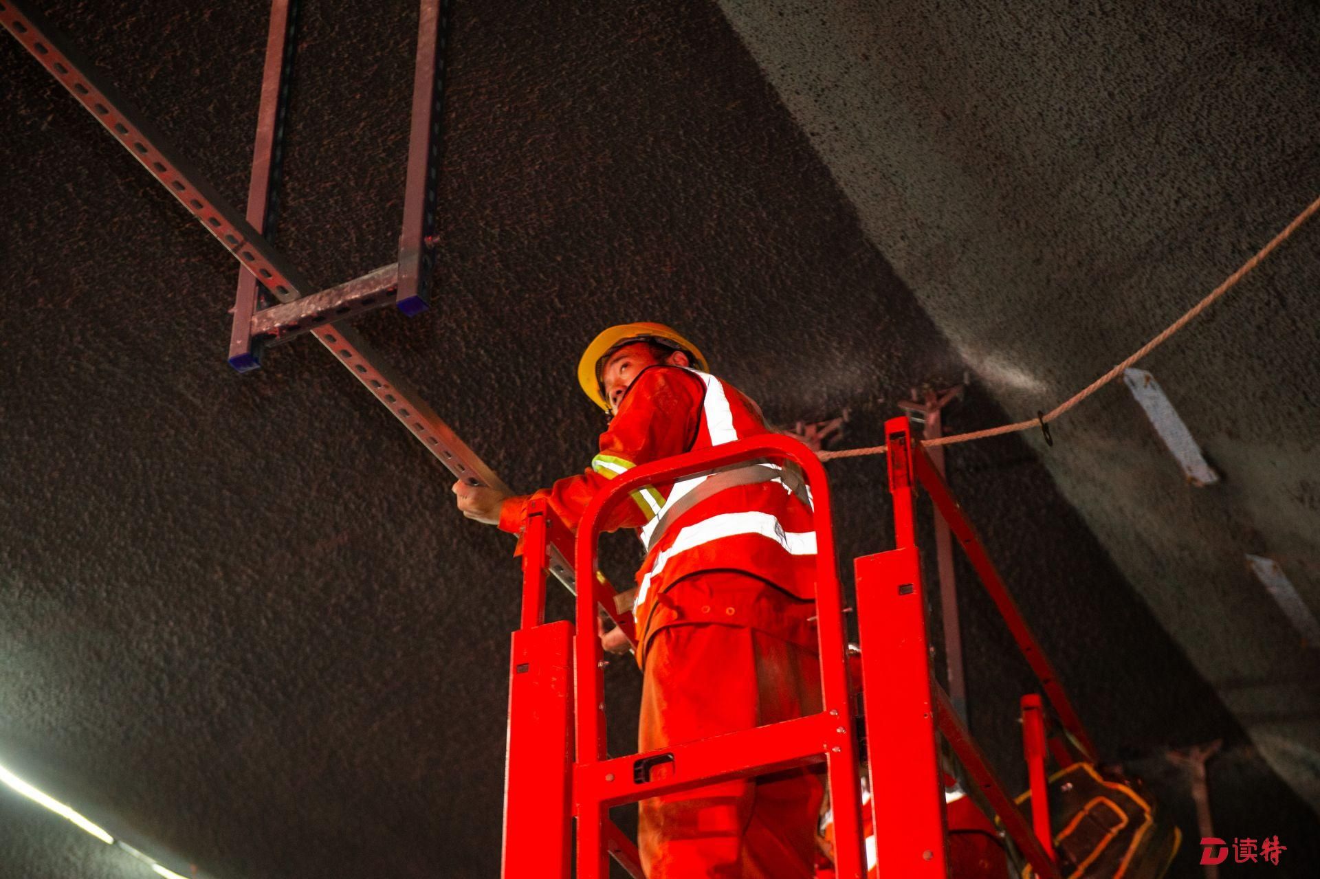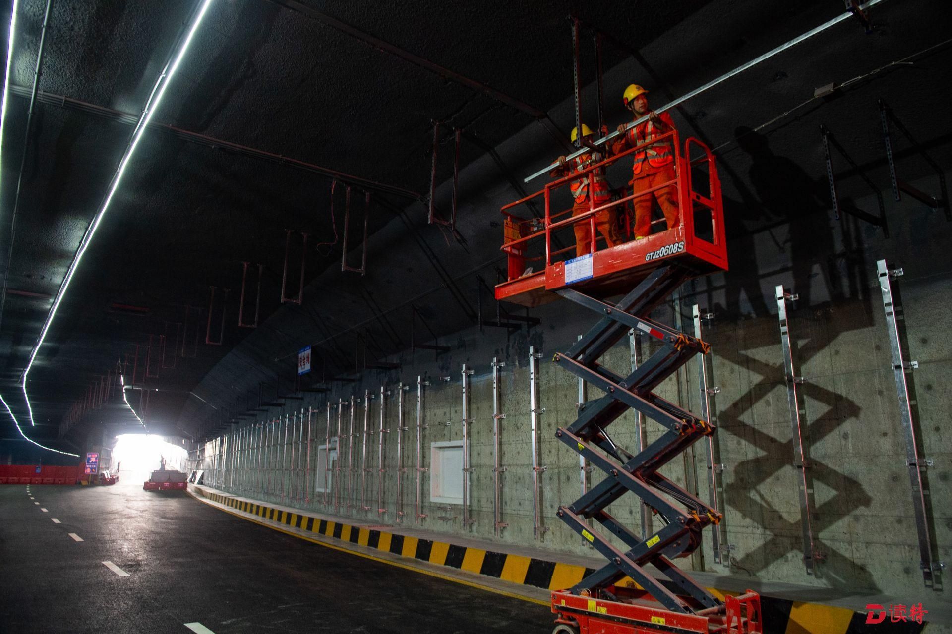 4月16日,讀特記者從臨海大道與前灣三路路口附近乘車進(jìn)入地下道路,看到前海地下道路已經(jīng)實(shí)現(xiàn)主體隧道貫通,項(xiàng)目進(jìn)入裝飾裝修和機(jī)電設(shè)備安裝階段,工人正在隧道內(nèi)安裝照明、通風(fēng)、排水、消防等設(shè)施。在項(xiàng)目工程樣版段,記者看到隧道兩側(cè)的已經(jīng)裝好搪瓷鋼板,頂部的連續(xù)燈帶和交通指示燈也已經(jīng)安裝到位,地面上也已經(jīng)劃好了分道線。中鐵四局機(jī)電公司相關(guān)負(fù)責(zé)人表示,目前前海地下道路機(jī)電裝修工程樣板已經(jīng)順利通過驗(yàn)收,為接下來大面積機(jī)電裝修施工提供了標(biāo)準(zhǔn)指引。該負(fù)責(zé)人表示:“全線共安排了一百多名工人,分區(qū)域進(jìn)行設(shè)備安裝和裝飾裝修,將確保項(xiàng)目年底竣工、2020年初通車,為前海發(fā)展提供更好交通保障?!?/p>