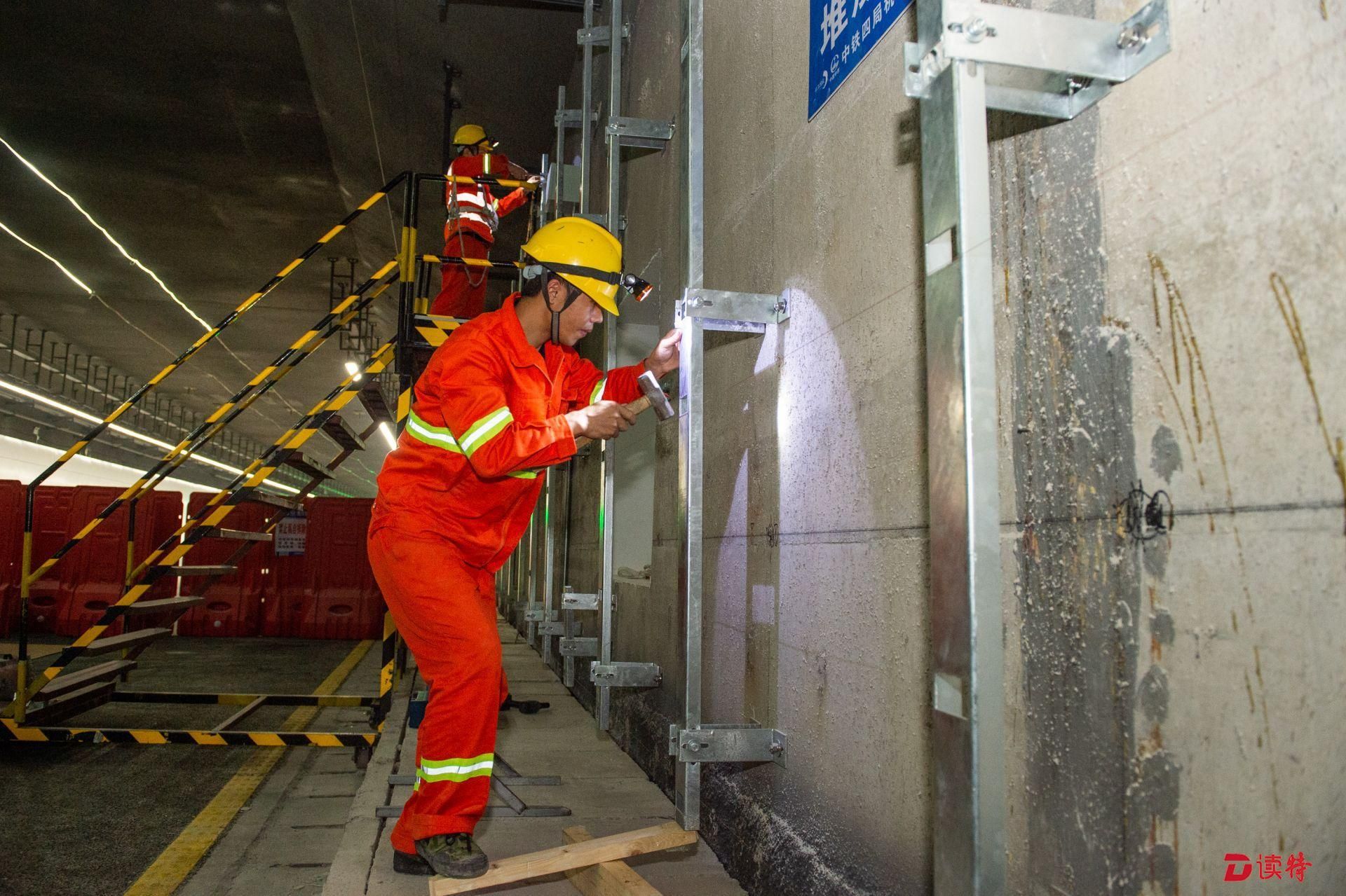 前海地下道路施工現(xiàn)場(chǎng),工人安裝、校正搪瓷鋼板龍骨