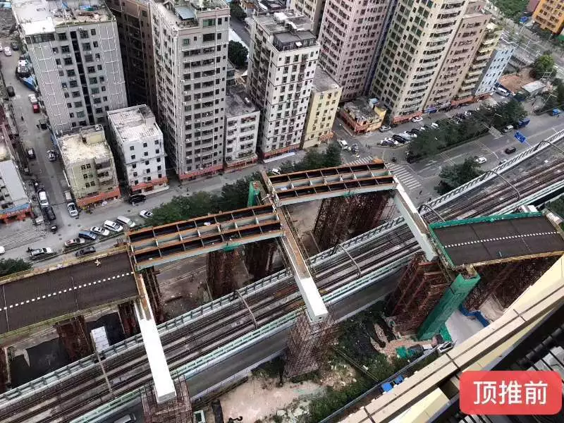 深圳地鐵6號線一期的紅山站至上塘北站區(qū)間由中鐵建大橋局承建,上跨正在運(yùn)營的地鐵4號線,兩條線最近處僅相隔1.2米。本次頂推高架為4孔30米雙線簡支鋼混結(jié)合梁,采用依次整體橫向頂推的方式,單孔梁重430噸,最大頂推距離17米,斜跨段平曲線半徑為450米,交叉角達(dá)30度。第一孔簡支鋼混結(jié)合梁于3月3日開始頂推,歷時22天,最后一孔于25日完美收工。