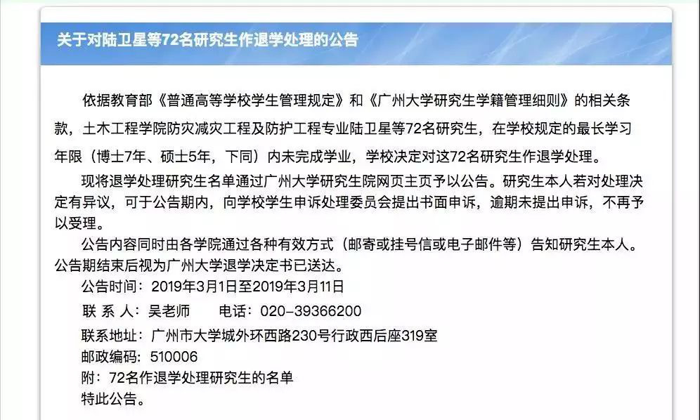 對(duì)46名碩士研究生予以退學(xué)處理,因其在學(xué)校規(guī)定的最長(zhǎng)學(xué)習(xí)年限內(nèi)未完成學(xué)業(yè),或超過學(xué)校規(guī)定期限未注冊(cè)而又無正當(dāng)理由,且未經(jīng)請(qǐng)假離校連續(xù)兩周未參加學(xué)校的教學(xué)活動(dòng)。