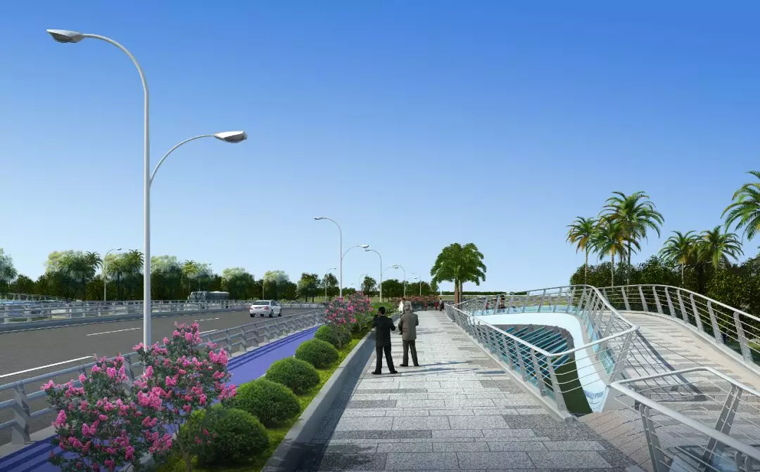 6號(hào)景觀橋以海浪為主題,橋體采用流線的曲面梁造型,在橋下形成富有視覺(jué)沖擊力的海洋波浪意象,同時(shí)以快慢分離、環(huán)境融合為設(shè)計(jì)理念,將橋梁、城市、綠地和水充分融合,形成一個(gè)多層次富于變化的橋梁空間,橋梁雙曲面造型奇特,屬于國(guó)內(nèi)第一無(wú)二的景觀橋。