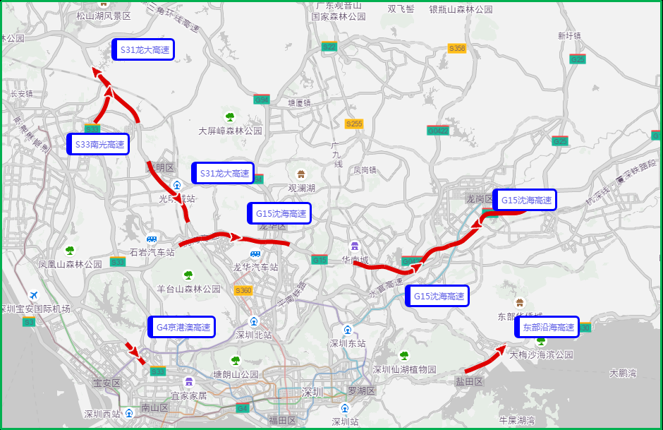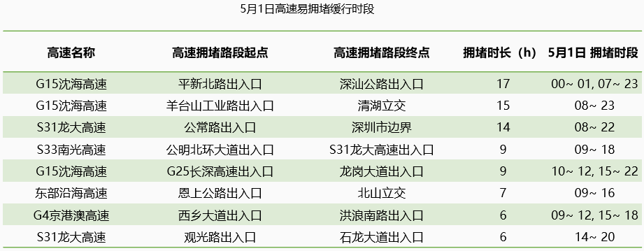 高德地圖交通大數(shù)據(jù)預(yù)測,五一期間深圳出行最容易擁堵緩行的5條高速分別是G15沈海高速、S31龍大高速、S33南光高速、東部沿海高速、G4京港澳高速等高速部分路段。