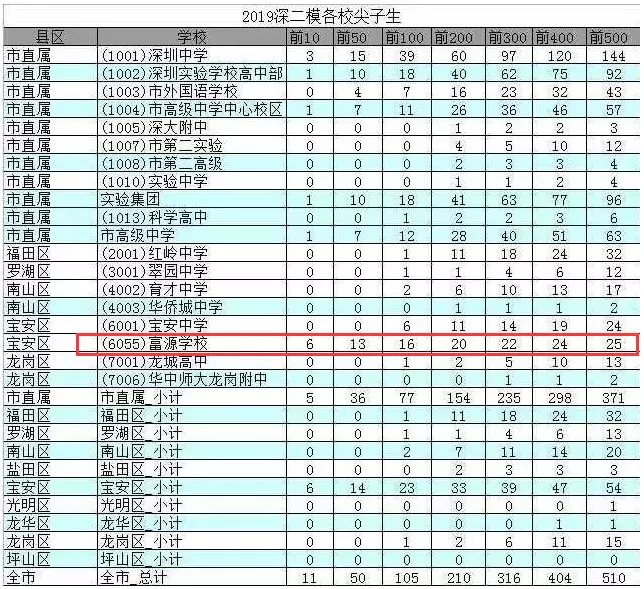 總分前十名中,深圳富源學(xué)校占了六人。前五十名,富源學(xué)校占了十三人,總分前一百名占了十六人??墒强偡智拔灏倜?,富源學(xué)校占到的數(shù)量卻沒(méi)有超過(guò)30人。