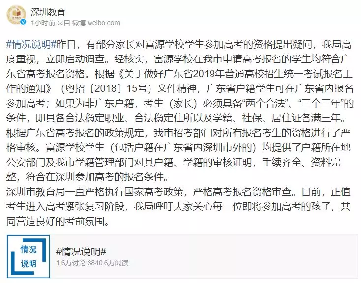 該回應(yīng)稱:經(jīng)核實,富源學(xué)校學(xué)生均提供了戶籍所在地公安部門及我市學(xué)籍管理部門對其戶籍、學(xué)籍的審核證明,手續(xù)齊全、資料完整,符合在深圳參加高考的報名條件。