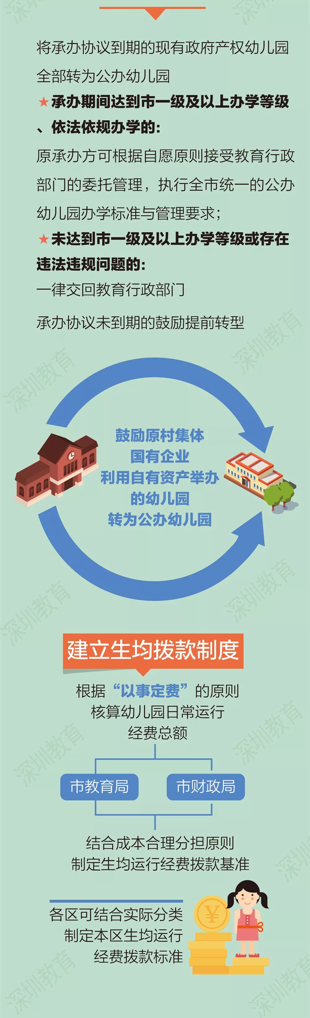 對(duì)于公辦園建設(shè)的途徑,《意見(jiàn)》同樣給出明確規(guī)定:各區(qū)要將產(chǎn)權(quán)屬于政府的新建幼兒園全部辦成公辦幼兒園。將承辦協(xié)議到期的現(xiàn)有政府產(chǎn)權(quán)幼兒園全部轉(zhuǎn)為公辦幼兒園,其中承辦期間達(dá)到市一級(jí)及以上辦學(xué)等級(jí)、依法依規(guī)辦學(xué)的,原承辦方可根據(jù)自愿原則接受所在區(qū)教育局行政部門的委托管理,執(zhí)行全市統(tǒng)一的公辦幼兒園辦學(xué)標(biāo)準(zhǔn)與管理要求;鼓勵(lì)承辦協(xié)議未到期的提前轉(zhuǎn)型。