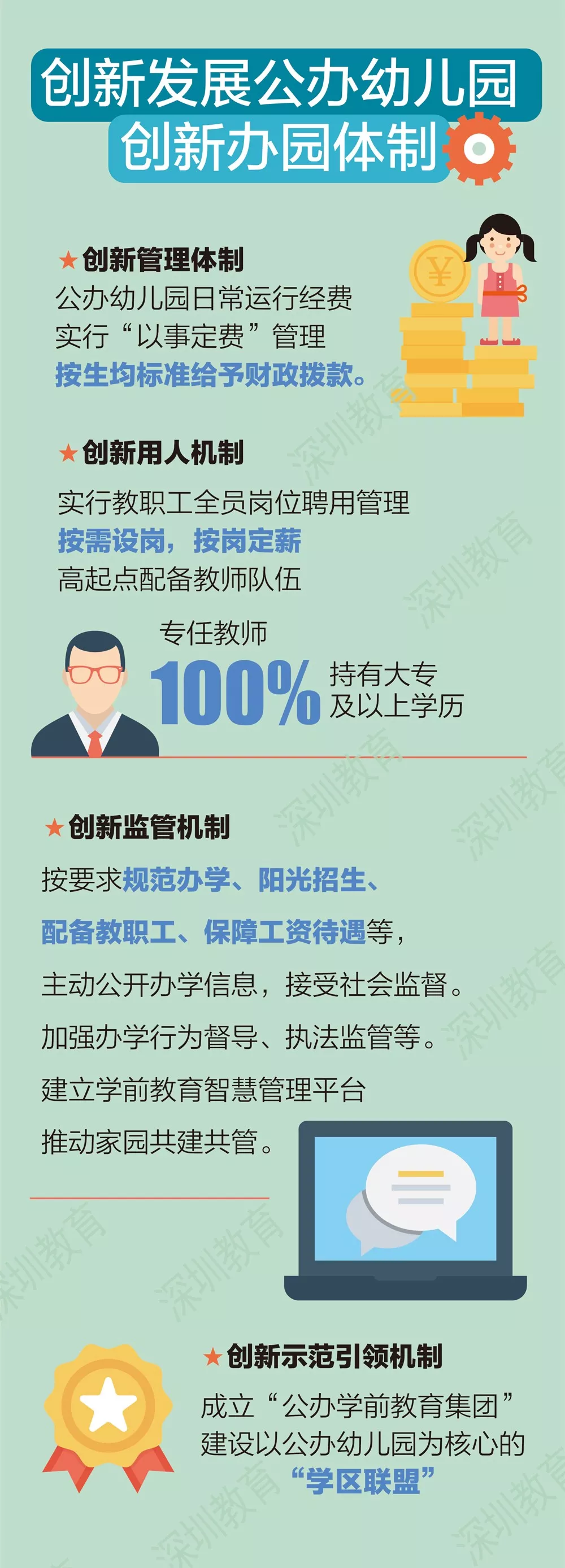 值得一提的是, 未來(lái)5年,深圳的學(xué)期教育也將著重在質(zhì)量上下大力氣。據(jù)介紹,深圳市教育局將從管理精細(xì)化、課程游戲化、環(huán)境生活化、保障制度化四方面著手,著力打造4個(gè)“100”,包括:打造100所示范園,培養(yǎng)100位名園長(zhǎng),培育100個(gè)示范項(xiàng)目,評(píng)選100位名師。學(xué)前教育的財(cái)政投入也將以區(qū)為投入,市、區(qū)通過(guò)年度學(xué)期教育專項(xiàng)經(jīng)費(fèi),加大財(cái)政投入規(guī)模,預(yù)計(jì)在2020年投入資金超100億元。
