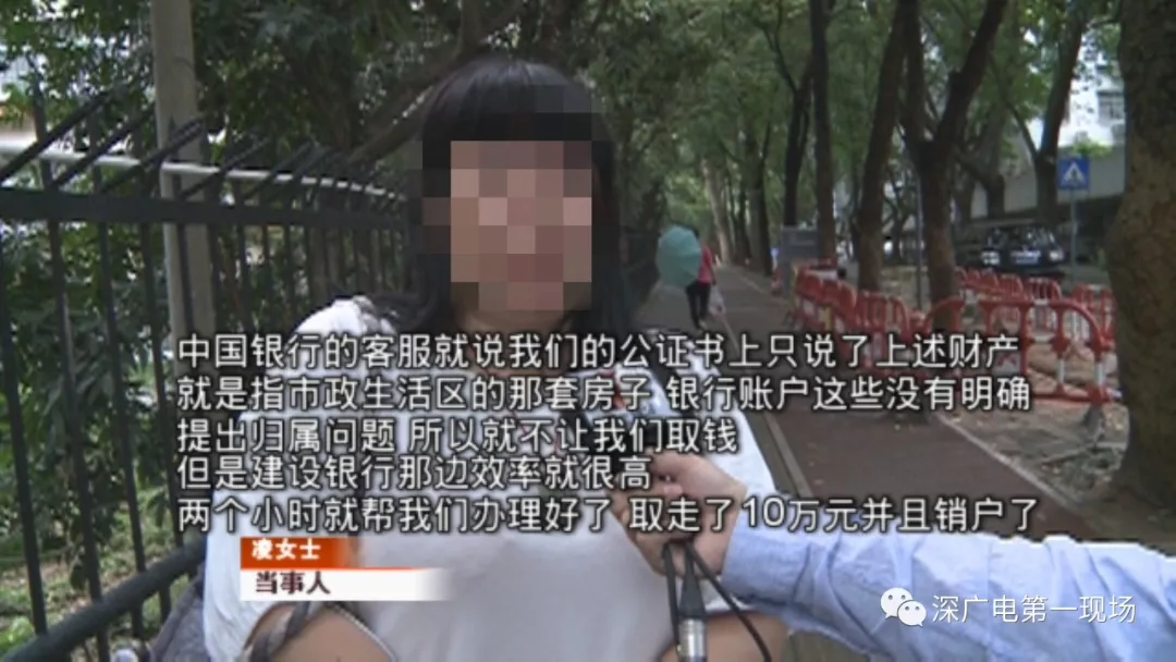 建設(shè)銀行賬戶的10萬(wàn)元,凌女士和婆婆周女士拿著相關(guān)資料,順利取款并做了銷戶處理。但是她們?nèi)サ街袊?guó)銀行福田支行時(shí),卻被銀行柜臺(tái)以公證書(shū)中未明確銀行賬戶歸屬為由,拒絕辦理取款銷戶業(yè)務(wù)。
