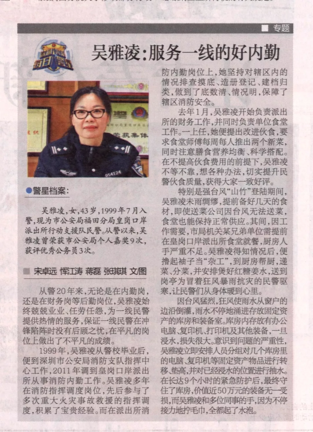 1999年,吳雅凌從警校畢業(yè)后,便到深圳市公安局消防支隊(duì)指揮中心工作,2011年調(diào)到皇崗口岸派出所從事消防內(nèi)勤工作。吳雅凌多年駐扎在消防指揮調(diào)度崗位,先后參與了多次重大火災(zāi)事故救援的指揮調(diào)度,積累了寶貴經(jīng)驗(yàn)。而在派出所消防內(nèi)勤崗位上,她堅(jiān)持對轄區(qū)內(nèi)的情況排查摸底、造冊登記、建檔歸類,做到了底數(shù)清、情況明,保障了轄區(qū)消防安全。