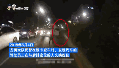 2019年5月4日1時(shí)41分許,深圳交警在龍崗區(qū)寶龍街道設(shè)卡查車(chē)時(shí),發(fā)現(xiàn)粵B號(hào)牌小型汽車(chē)的駕駛員正在與后排座位的人交換座位。