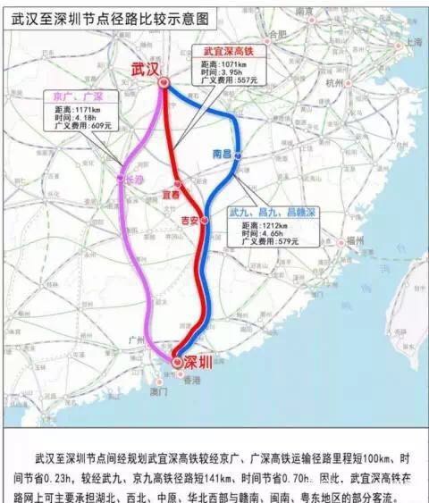 據(jù)了解,為了分流日益飽和的京廣高鐵客流,湖北提出擬在武漢和深圳之間建設(shè)一條高鐵。武深高鐵大致走向為:武漢 -咸寧 -修水 -銅鼓 -宜豐 -萬載 -宜春 -安福 -井岡山 -遂川 -贛州 -深圳。一旦建成,將形成武漢到深圳的一條筆直線路。初步預(yù)測分析,新規(guī)劃的武漢至深圳高速鐵路,較經(jīng)京廣、廣深高鐵運(yùn)輸徑路里程短100多公里,時間節(jié)省20分鐘;較經(jīng)武九、京九高鐵徑路短141公里,時間節(jié)省42分鐘。