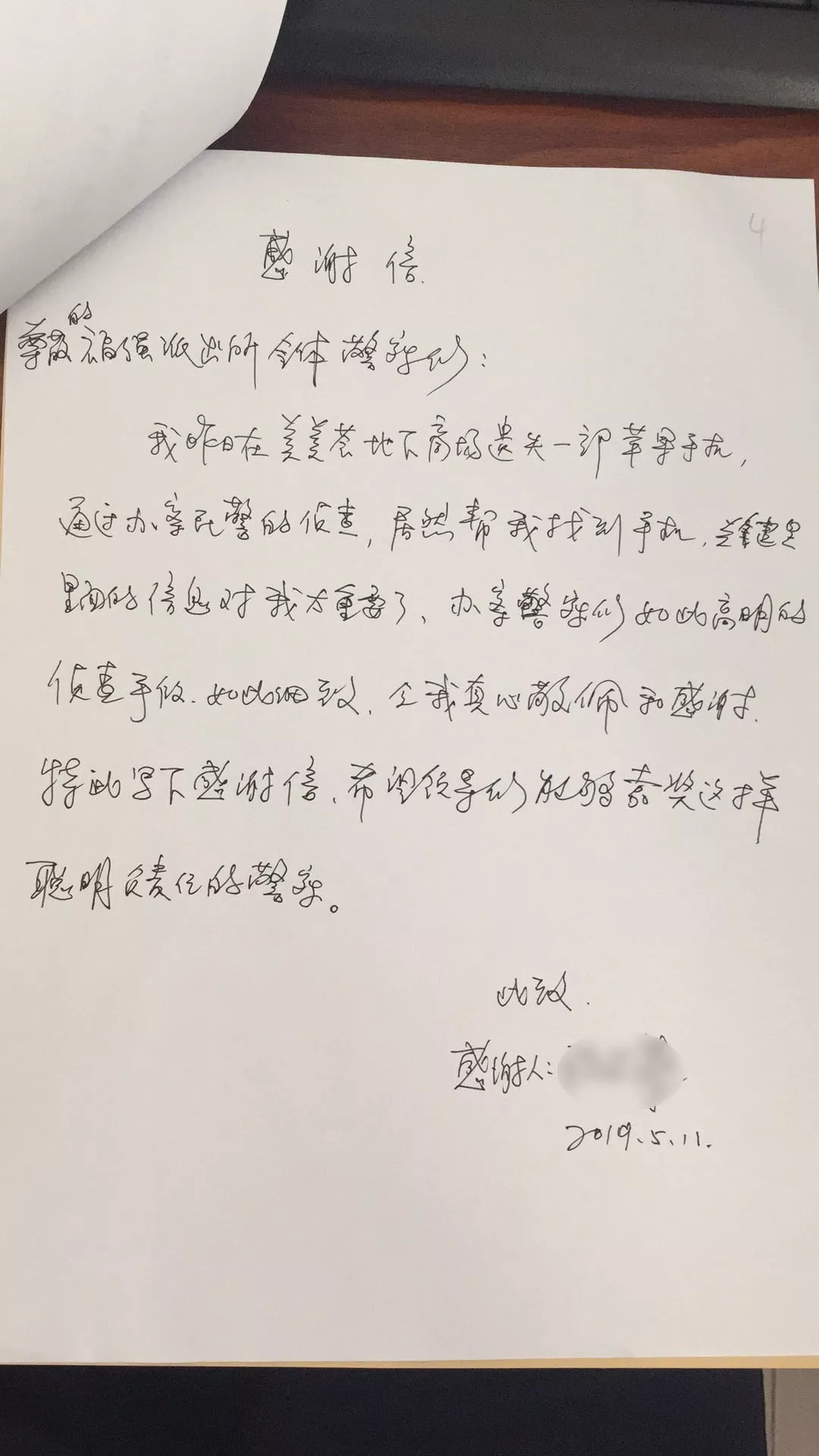 “手機里面的信息太重要了,辦案警察們?nèi)绱烁呙鞯膫刹槭侄?,如此細致,令我真心敬佩和感謝!”5月11日晚,程女士在福強派出所的前臺激動地手寫了這封感謝信。