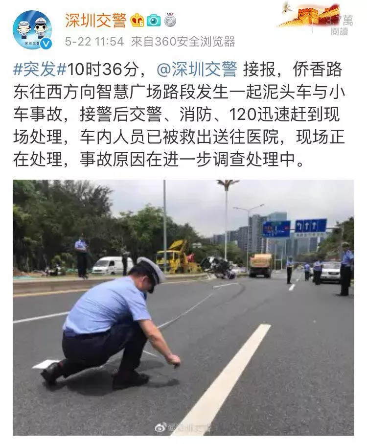 據(jù)@深圳交警官方微博消息,10時36分,僑香路東往西方向智慧廣場路段發(fā)生一起泥頭車與小車事故,接警后交警、消防、120迅速趕到現(xiàn)場處理,車內人員已被救出送往醫(yī)院,現(xiàn)場正在處理,事故原因在進一步調查處理中。
