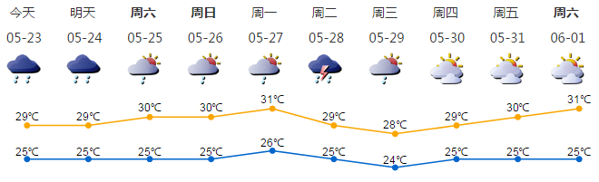 我市陰天間多云,有陣雨,部分時間雨勢較大;氣溫25-29℃;東南風(fēng)2-3級;相對濕度65%-95%