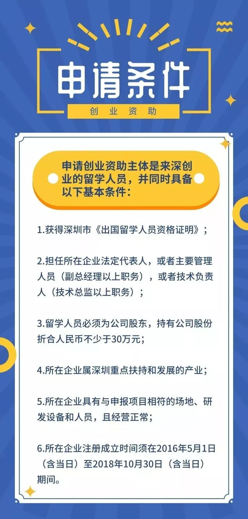 2.申請(qǐng)人或者申報(bào)單位曾獲得深圳市科技主管部門發(fā)放的科技研發(fā)資金中的留學(xué)人員創(chuàng)業(yè)資助、海外高層次人才創(chuàng)新創(chuàng)業(yè)資助等。