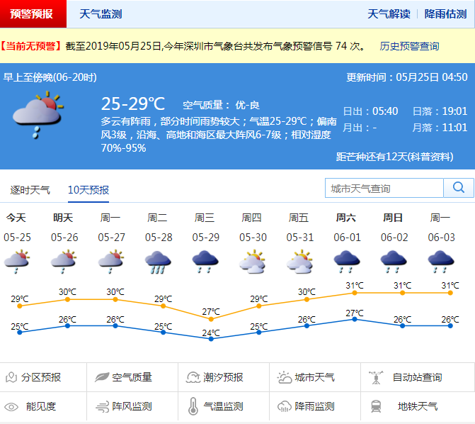 記者從深圳市氣象臺獲悉,25日大部分時(shí)間以陰天間多云為主,有短時(shí)陣雨或雷陣雨,局部地區(qū)雨勢較大,短時(shí)陣雨大概率出現(xiàn)在中午之后;氣溫25-29℃,中午時(shí)段體感相對較熱;南風(fēng)清勁,沿海和高地最大陣風(fēng)6-7級;相對濕度70%-95%,空氣濕度較大,略顯悶熱。26-27日多云為主,有短時(shí)(雷)陣雨,局部地區(qū)雨勢較大;展望28日前后有一場強(qiáng)雷雨過程。