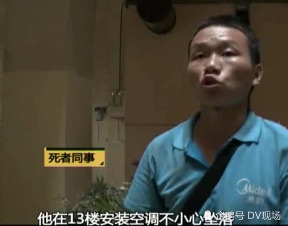從拍攝的視頻可以看到,死者當時是穿著有"美的公司"公司字樣的衣服,目擊者說,死者是在13樓安裝空調(diào)外機時出事的。