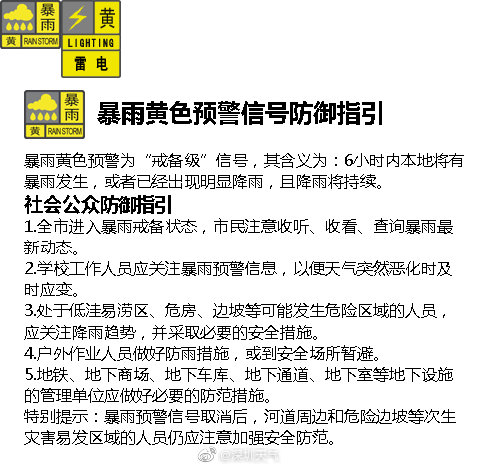 市民注意收聽、收看、查詢暴雨最新動(dòng)態(tài)。學(xué)校工作人員應(yīng)關(guān)注暴雨預(yù)警信息,以便天氣突然惡化時(shí)及時(shí)應(yīng)變。處于低洼易澇區(qū)、危房、邊坡等可能發(fā)生危險(xiǎn)區(qū)域的人員,應(yīng)關(guān)注降雨趨勢,并采取必要的安全措施。戶外作業(yè)人員做好防雨措施,或到安全場所暫避。5.地鐵、地下商場、地下車庫、地下通道、地下室等地下設(shè)施的管理單位應(yīng)做好必要的防范措施。特別提示:暴雨預(yù)警信號取消后,河道周邊和危險(xiǎn)邊坡等次生災(zāi)害易發(fā)區(qū)域的人員仍應(yīng)注意加強(qiáng)安全防范。