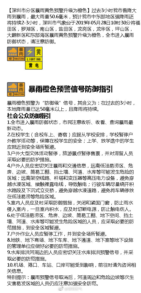 【深圳市分區(qū)暴雨黃色預(yù)警升級為橙色】過去3小時(shí)我市普降大雨到暴雨,最大雨量50.6毫米,預(yù)計(jì)我市中東部地區(qū)強(qiáng)降雨還將持續(xù)2-3小時(shí),深圳市氣象臺于2019年05月28日10時(shí)30分將福田區(qū),羅湖區(qū),南山區(qū),鹽田區(qū),龍崗區(qū),龍華區(qū),坪山區(qū),大鵬新區(qū)和東部海區(qū)暴雨黃色預(yù)警升級為橙色,全市進(jìn)入暴雨防御狀態(tài),請注意防御。