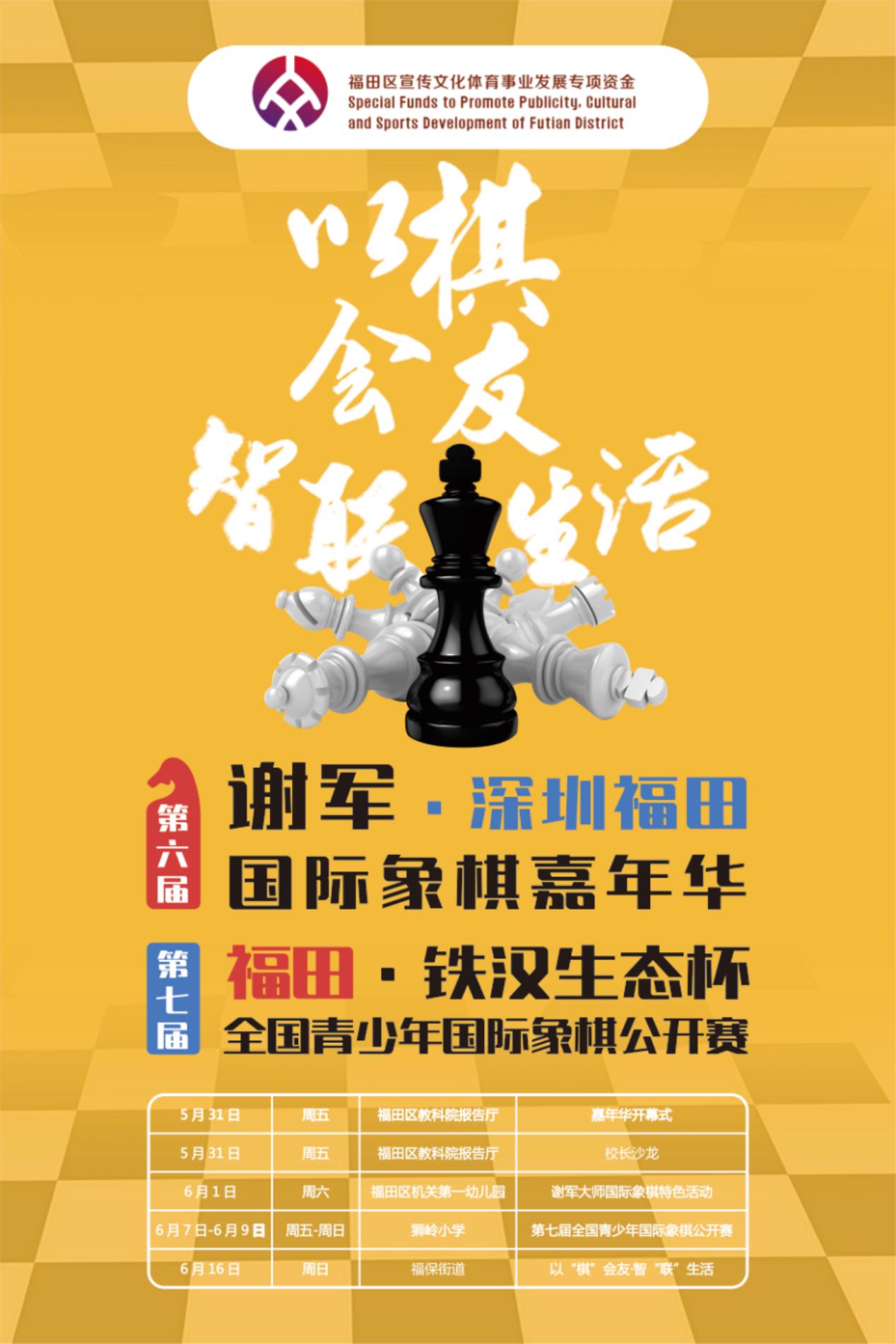 深圳新聞網(wǎng)5月29日訊 福田區(qū)一年一度的體育盛事——2019年第六屆“謝軍?深圳(福田)國際象棋嘉年華”暨第七屆“福田?鐵漢生態(tài)杯”全國青少年國際象棋公開賽即將于2019年5月31日在福田區(qū)教科院附屬小學隆重開幕。
