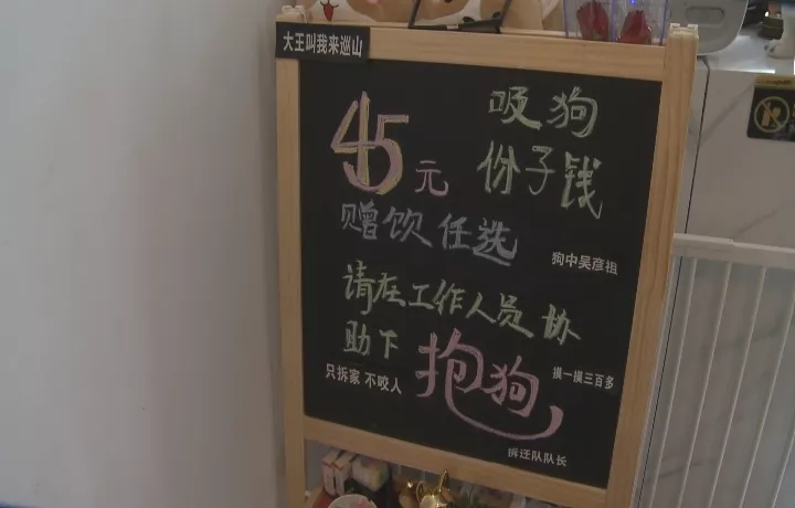 雖然不是周末,還是有顧客在里面消費(fèi),記者看到,收費(fèi)欄寫著45元吸狗份子錢,贈(zèng)送飲品。