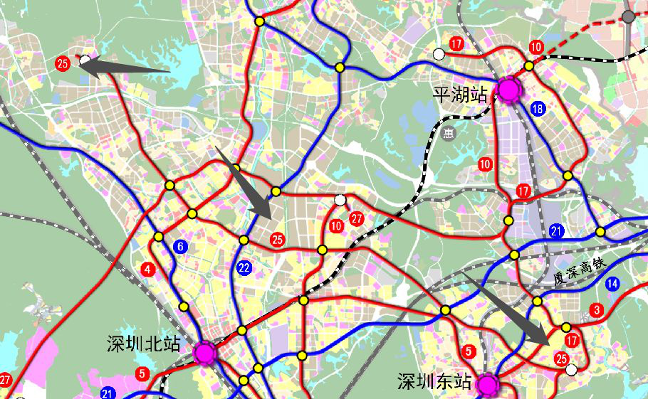 根據(jù)《深圳市城市軌道線網(wǎng)規(guī)劃(2016-2030)》,25號線定位為支撐深圳市北部發(fā)展帶的普速服務(wù)線。線路聯(lián)系龍華、坂田、布吉等橫向二圈層片區(qū),增加沿線片區(qū)的軌道覆蓋率,加強橫向聯(lián)系,同時與5條縱向軌道快、干線換乘,喂給客流,完善軌道線網(wǎng)結(jié)構(gòu)。