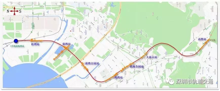 深圳地鐵5號線南延段,即5號線二期工程,北起于5號線前海灣站,經(jīng)前海、南山,終點(diǎn)與地鐵2號線赤灣站換乘。線路全長約7.7千米,全線采用地下敷設(shè)方式,設(shè)站7座。