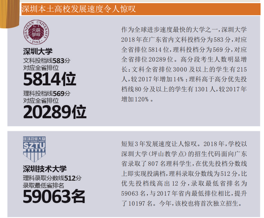 需要特別指出的是,去年廣東省合并一二本批次,在本科批次錄取時(shí),率先錄取高分優(yōu)先投檔線(簡(jiǎn)稱“高優(yōu)線”)上的考生。根據(jù)最終數(shù)據(jù)顯示,深圳6所本科高校投檔線全部在高優(yōu)線以上。