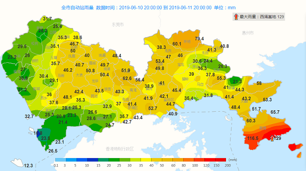 圖說:11日深圳全市日降雨量(單位:毫米,截止至11日16時(shí)05分)