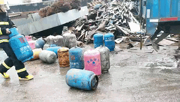 現(xiàn)場消防員還搶出煤氣瓶,記者現(xiàn)場聞到煤氣的味道,據(jù)了解,有些煤氣瓶還有氣,危險程度可想而知▼