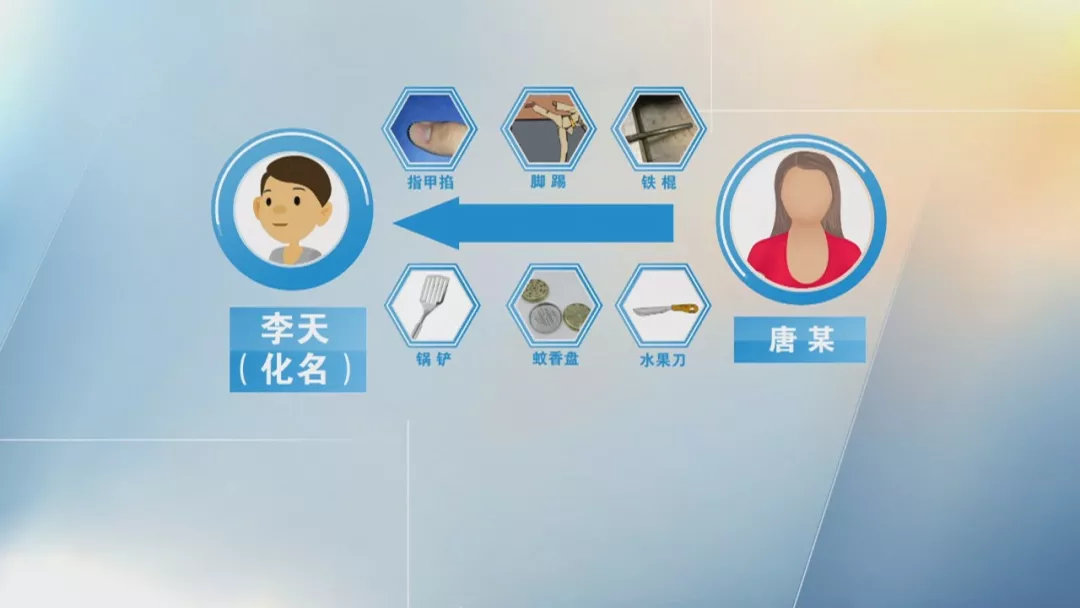 5月30號(hào),唐某以李天洗碗沒洗干凈為由,用金屬漏勺抽打其手臂背部及頭部,導(dǎo)致李天頭部嚴(yán)重出血,后經(jīng)鑒定為輕微傷。