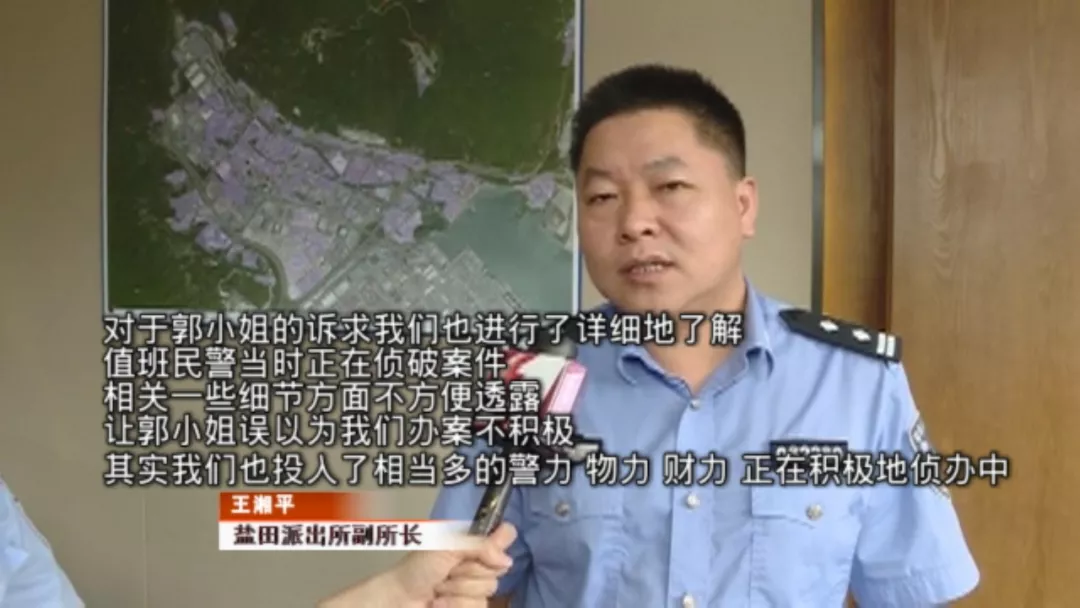 派出所表示,案件正在偵查當(dāng)中記者也和郭女士來到鹽田派出所,由于負(fù)責(zé)此案的蔡警官正值休假,派出所的一位值班領(lǐng)導(dǎo),對郭女士當(dāng)時所遭遇的處境,進(jìn)行了情況說明。