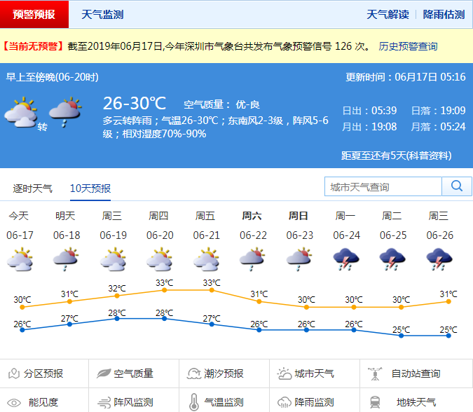 深圳市氣象局預(yù)計(jì)17日白天有陣雨或雷陣雨,局部大雨;18日多云有短時(shí)陣雨或雷陣雨;19-20日多云間晴,局部地區(qū)有短時(shí)陣雨,天氣炎熱;21日多云有短時(shí)陣雨。22-24日,陰天,有陣雨或雷陣雨。