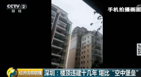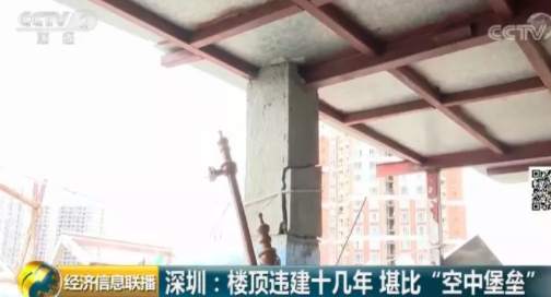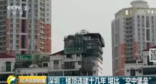 深圳福田區(qū)一個小區(qū)的居民日前爆料稱,小區(qū)一位業(yè)主違規(guī)在天臺上加建了幾層樓,遠遠看去就像一個“空中堡壘”,曾經(jīng)有人差點被上面掉落的鋼筋砸中,如此醒目的違建,已經(jīng)存在了十幾年。