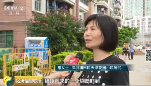 深圳福田區(qū)天澤花園小區(qū)居民常女士:我自己本人曾經(jīng)就在這下邊,被掉下來的一個鋼筋嚇到,當(dāng)時離這個鋼筋掉下來的位置就只有兩米遠。