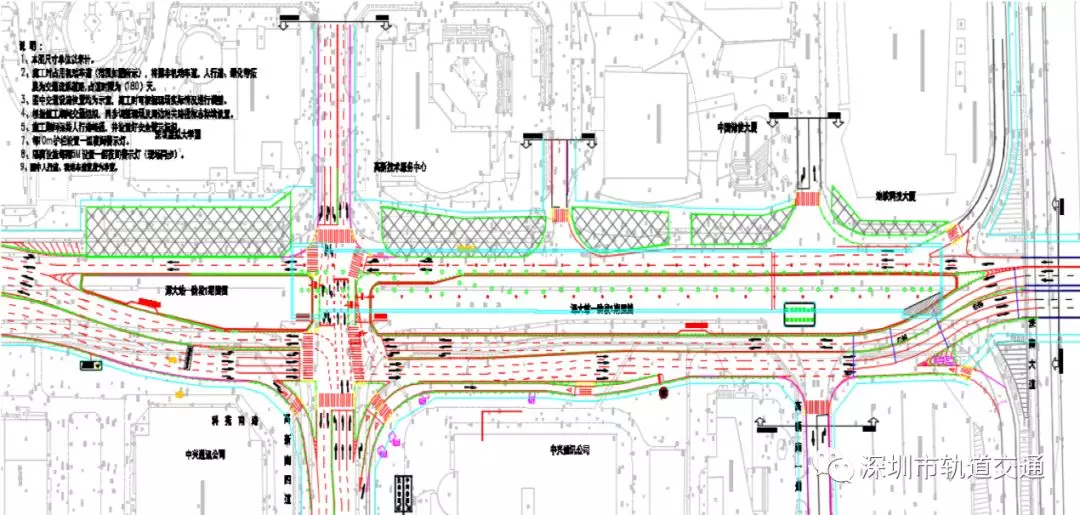 由于深大站位于高新科技園附近,上下班期間人、車流量較大,為不妨礙正常交通,項目部決定利用科苑路西側2條現(xiàn)狀車道及東側5條新建車道對科苑路交通進行疏解,首先圍蔽車站東半幅進行地連墻及抗拔樁施工,并同步實施車站西側給排水改遷施工及西側2條新建車道疏解路面施工。