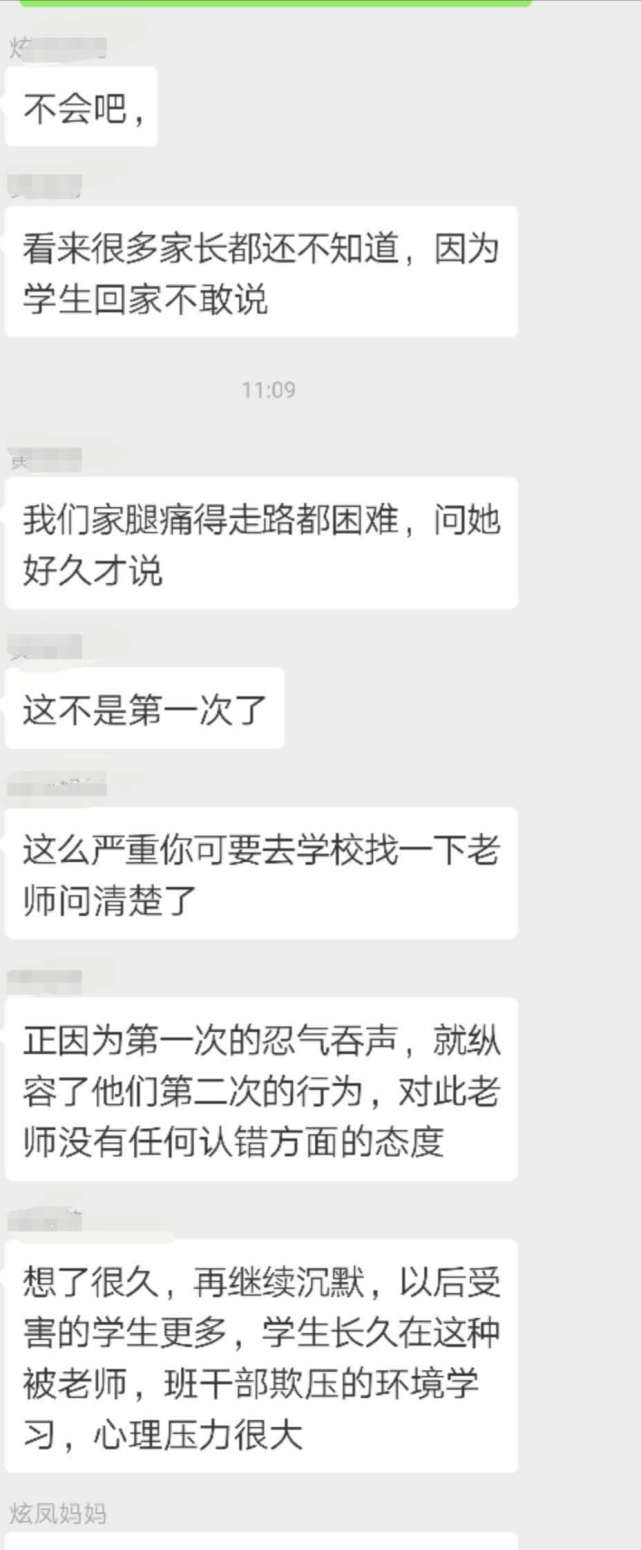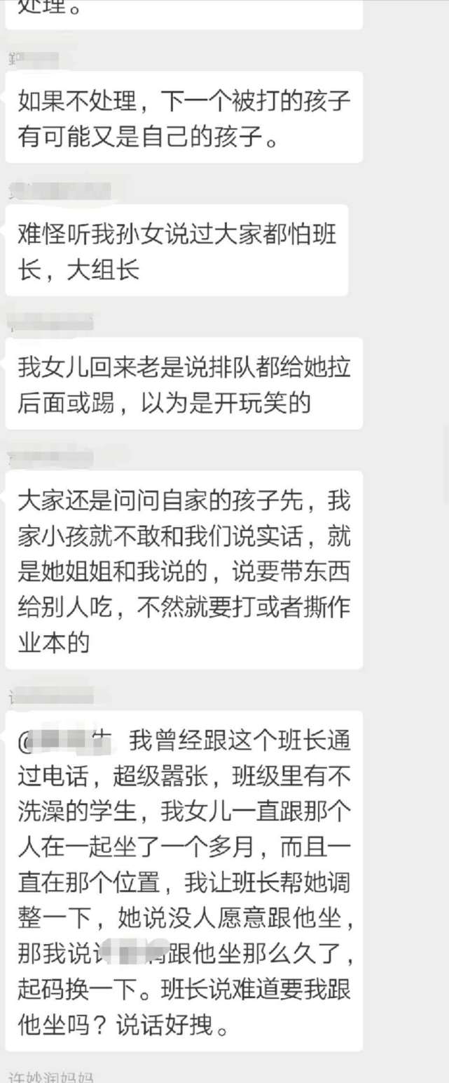 王先生把女兒的情況反映到家長群里,結果群里的家長紛紛表示,自己的孩子也反映當天遭遇到班長的毆打,有的孩子甚至“腿疼得難以走路”。而據(jù)孩子反映,其實類似的毆打在班上已經(jīng)不止發(fā)生過一次。這名班長是女生,平時很受班主任的信任,經(jīng)常利用班干部的權力隨意懲罰學生?!八?jīng)多次要求班上同學給自己帶零食吃,不然就會被撕作業(yè)和毆打,還威脅不準告訴家長?!蓖跸壬Q,家長們已經(jīng)將情況反映給班主任,但是班主任的反應“相當冷淡”,只是說會了解一下情況。25日下午,記者電話聯(lián)系到了王先生女兒的班主任,他表示已經(jīng)就此事對班長進行了批評教育,但對于班長此前多次毆打同學的行為他表示并不知情,“當初讓這名同學做班長是因為她成績好,而且守紀律。而且我覺得,孩子之間有些矛盾很正常?!卑嘀魅握f。(記者 李東明)