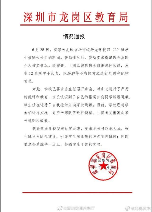 深圳新聞網(wǎng)2019年6月26日訊 近日,關于深圳一小學班長對同學拳打腳踢的輿情網(wǎng)上熱傳?記者26日從龍崗區(qū)教育局獲悉,該班班長確實對12名學生以踢腳等不當方式進行紀律管理。事情發(fā)生后,學校已對該班班長進行了嚴厲的批評教育,該班班主任也進行自我檢討和道歉。目前,學校已對學生進行安撫,對班干部隊伍進行了調整。
