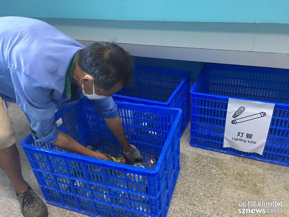 “有害垃圾包括電池、各種形狀的燈管及棄置藥品藥具等,需要專業(yè)人員來收?!鄙钲谑欣诸愂聞?wù)管理中心甘先生解釋了有害垃圾被鄧伯“落下”的原因。隨后,記者見到了危險的一面:當(dāng)天,在專業(yè)人員搬運有害垃圾時,燈管突然破裂,碎了一地,散發(fā)出異常氣體,戴著特殊口罩及手套的他們?nèi)匀挥畜@無險地完成了運送工作?!斑@確實很危險,但我們的工作人員都經(jīng)歷過嚴(yán)格的上崗培訓(xùn),也配置了齊全裝備,所以基本沒有發(fā)生過不可控的危險事件?!背羞\有害垃圾的安信美實業(yè)有限公司黃金良介紹道。