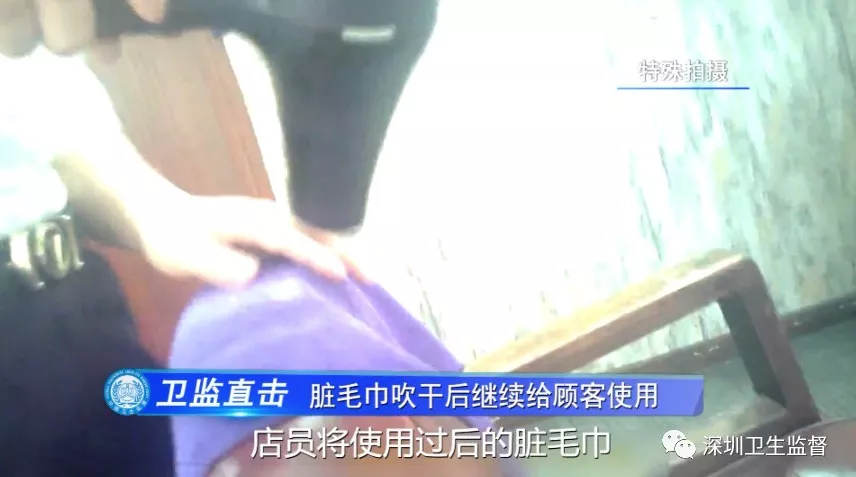更讓人無法接受的是,當(dāng)干凈毛巾不夠用的時(shí)候,店員將使用過后的臟毛巾,未經(jīng)過清洗消毒,就用吹風(fēng)機(jī)吹干后,重新放回干凈毛巾取用架內(nèi),繼續(xù)直接給顧客洗頭、擦臉用。