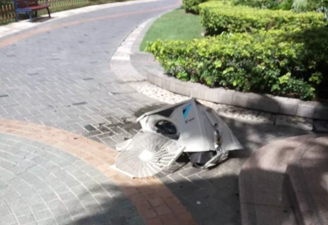 深廣電第一現(xiàn)場(chǎng)2019年7月1日訊 今天下午,福田區(qū)萬(wàn)科金色家園小區(qū)一臺(tái)空調(diào)主機(jī)從11樓墜下!巨大的聲音把業(yè)主嚇得不輕!??!空調(diào)外機(jī)應(yīng)該是固定好的怎么就會(huì)掉下來(lái)了?